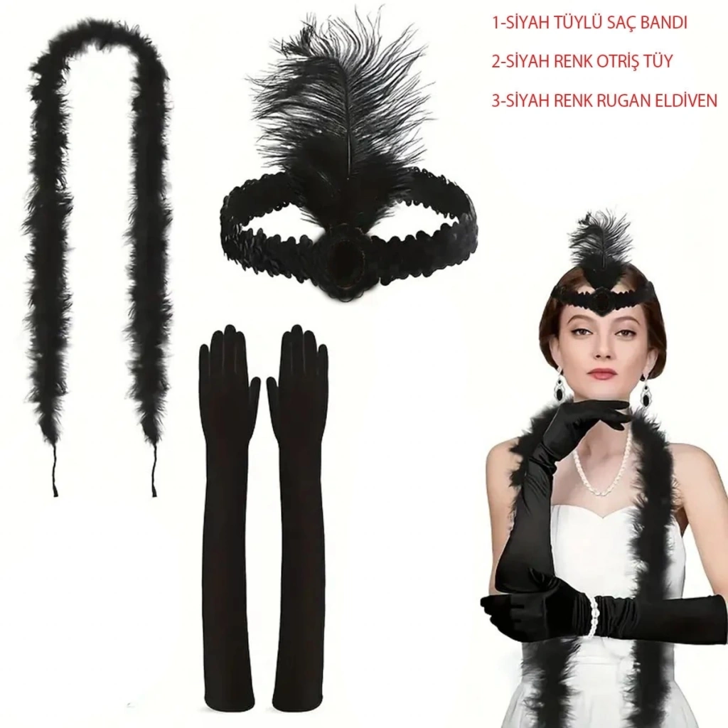 Şıklığı ve asaleti bir arada sunan Siyah 3&rsquolü Kostüm Aksesuar Seti, özel davetler, partiler, kına geceleri, bekârlığa veda organizasyonları ve 1920&rsquoler temalı konseptlerde tarzınızı tamamlamak için ideal bir seçimdir.