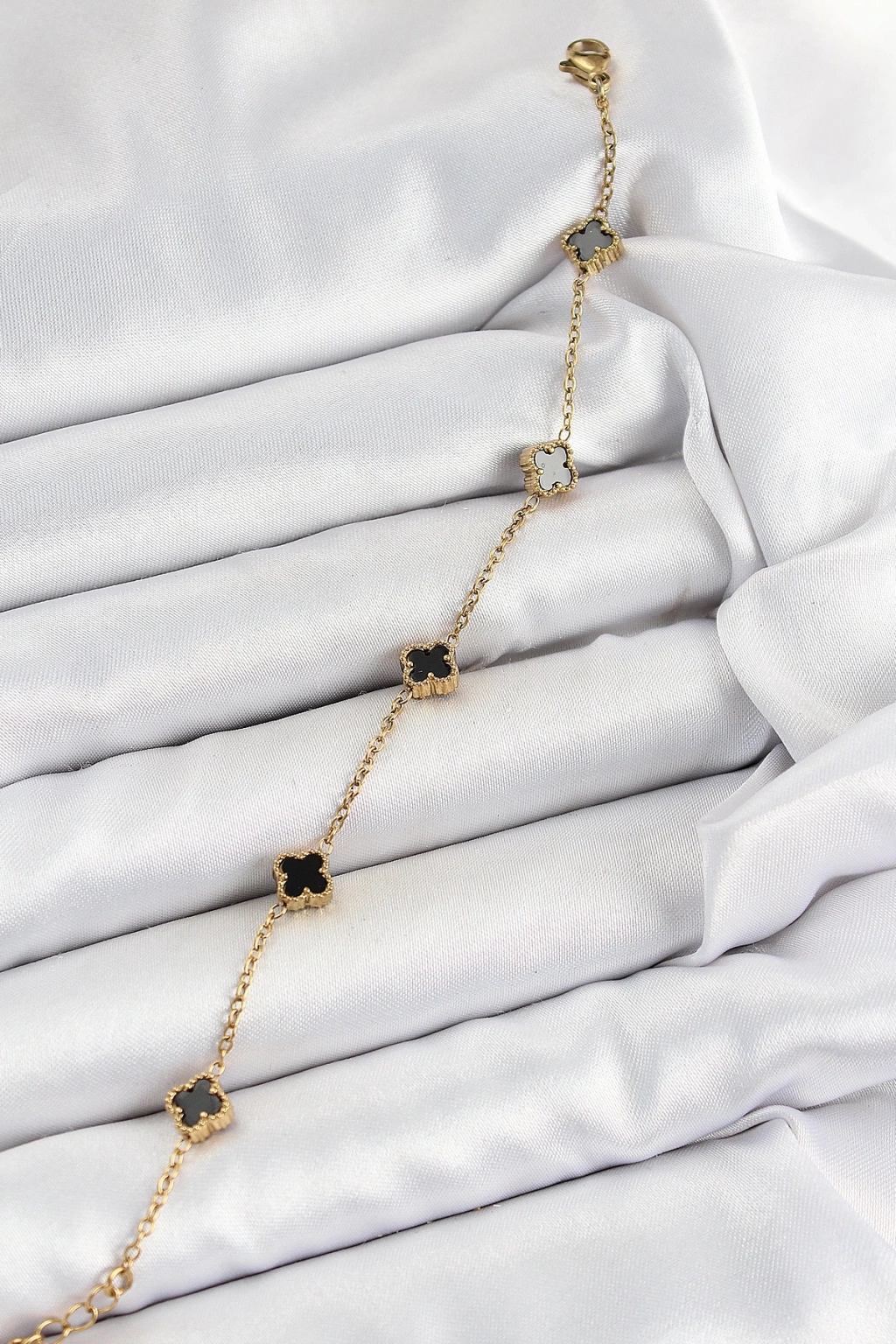 316l Çelik Siyah Sedef Yonca Model Gold Renk Kadın Bileklik