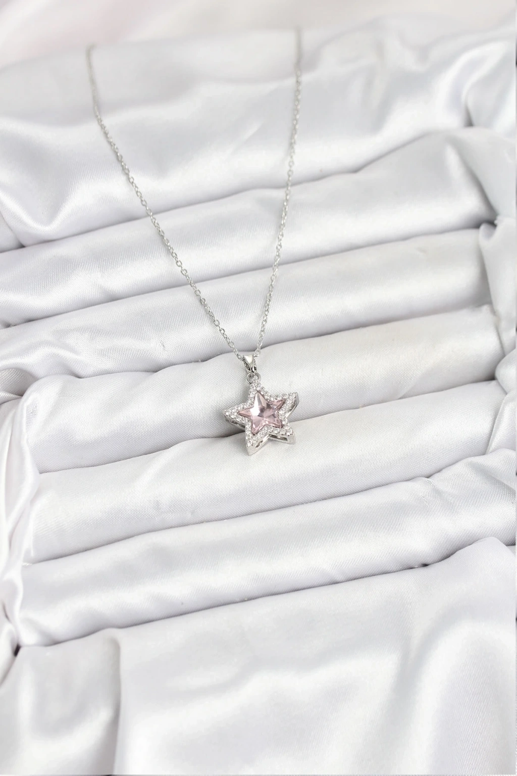 316l Çelik Zincir Gümüş Renk Pembe Taşlı Yıldız Model Kadın Kolye