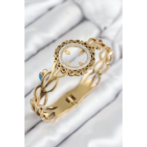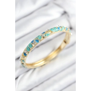 Mineli Pirinç Zirkon Taşlı Turkuaz Mavi Çiçek Motifli Gold Kadın Kelepçe