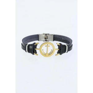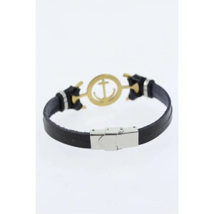 Gold Renk Deniz Çapası Figürlü Metal Aksesuarlı Siyah Renk Deri Erkek Bileklik