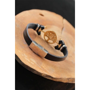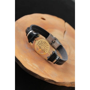 Gold Renk Metal Ağaçlı Tasarım Siyah Renk Deri Erkek Bileklik
