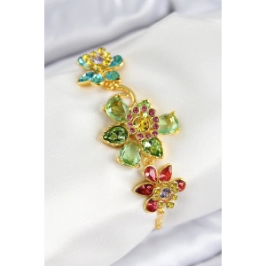 Mineli Pirinç Zirkon Taşlı Pembe Mor Çiçek Motifli Gold Kadın Kelepçe