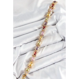 Pirinç Karışık Zirkon Taşlı Kare Model Gold Renk Lastikli Kadın Bileklik
