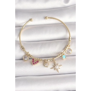 Pirinç Gold Renk Sallantı Zirkon Taşlı Kalp Figür Pembe Kalp Detay Charm Kadın Bileklik