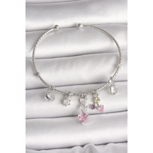 Pirinç Gümüş Renk Sallantı Zirkon Taşlı Kalp Figür Charm Kadın Bileklik