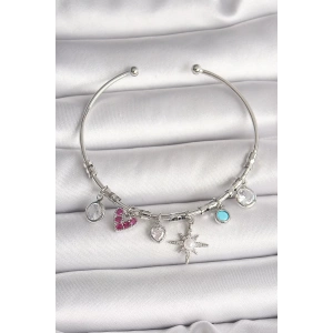 Pirinç Gümüş Renk Sallantı Zirkon Taşlı Kutup Yıldız Figür Kalp Detay Charm Kadın Bileklik