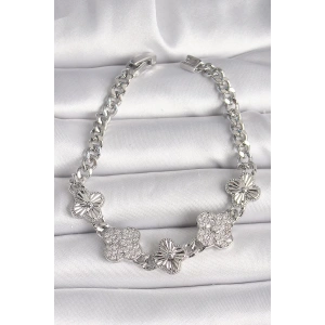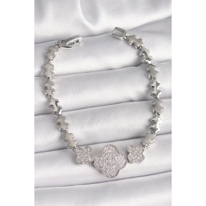 Pirinç Gümüş Renk Zirkon Taşlı Yonca Model Zincir Model Kadın Bileklik