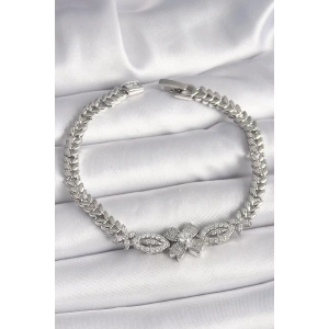 Pirinç Gümüş Renk Zirkon Taşlı Kelebek Model Zincir Kadın Bileklik