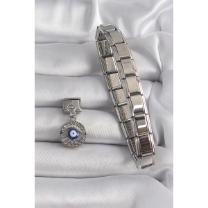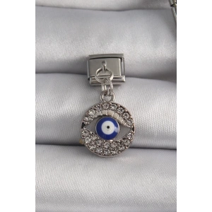 316L Çelik Gümüş Renk Sallantı Zirkon Taşlı Göz Model Nazar Boncuk Detay Nomination Charm