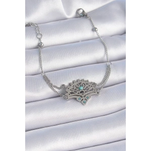 316L Çelik Gümüş Renk Mavi Taşlı Etnik Desen Kadın Bileklik