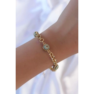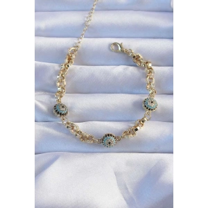 316L Çelik Gold Renk İtalyan Zincir Zirkon Taşlı Göz İşlemeli Madalyon Model Kadın Bileklik