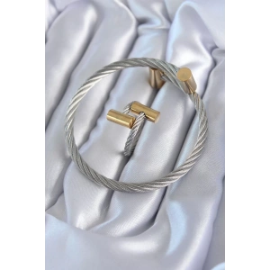 316L Çelik Gümüş Renk Gold Detay Sarmal Model Erkek Bileklik Yüzük Kombini