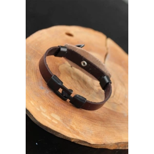 Siyah Deniz Çapalı Çelik Aksesuarlı Kahverengi Deri Erkek Bileklik