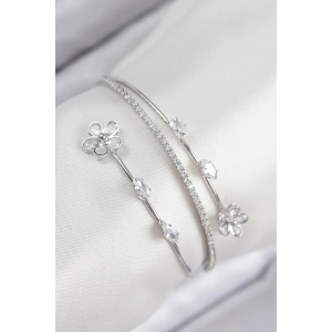 Pirinç Zirkon Taşlı Çiçek Model Gümüş Renk Kadın Bileklik