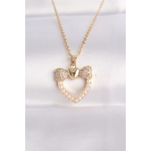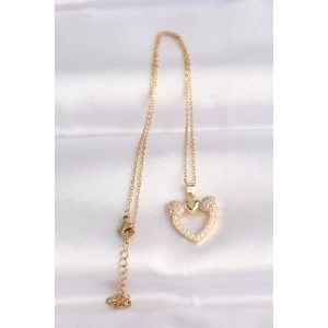 316L Çelik Zincir Altın Renk İnci Taş Detay Zirkon Taşlı Kalp Kolye