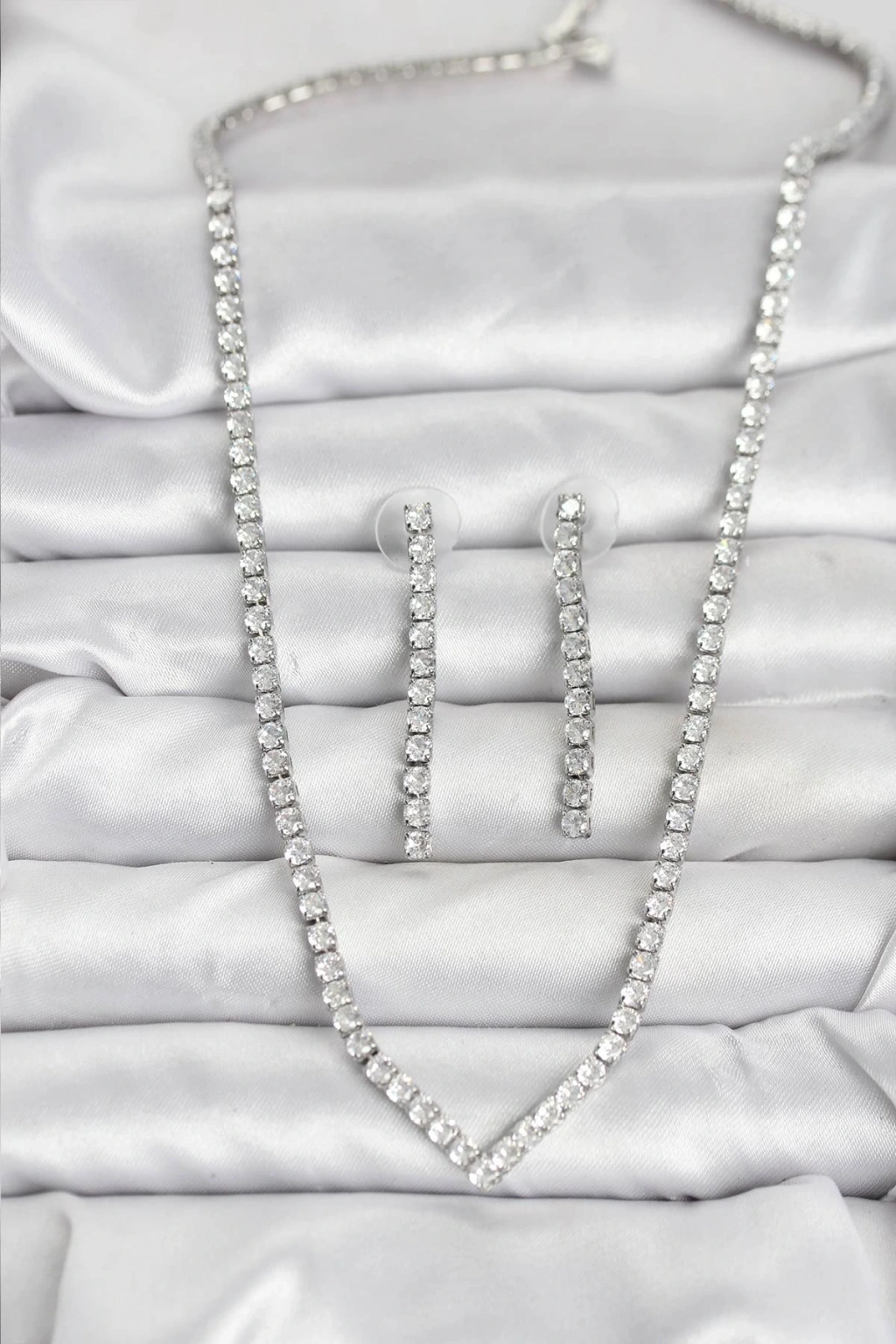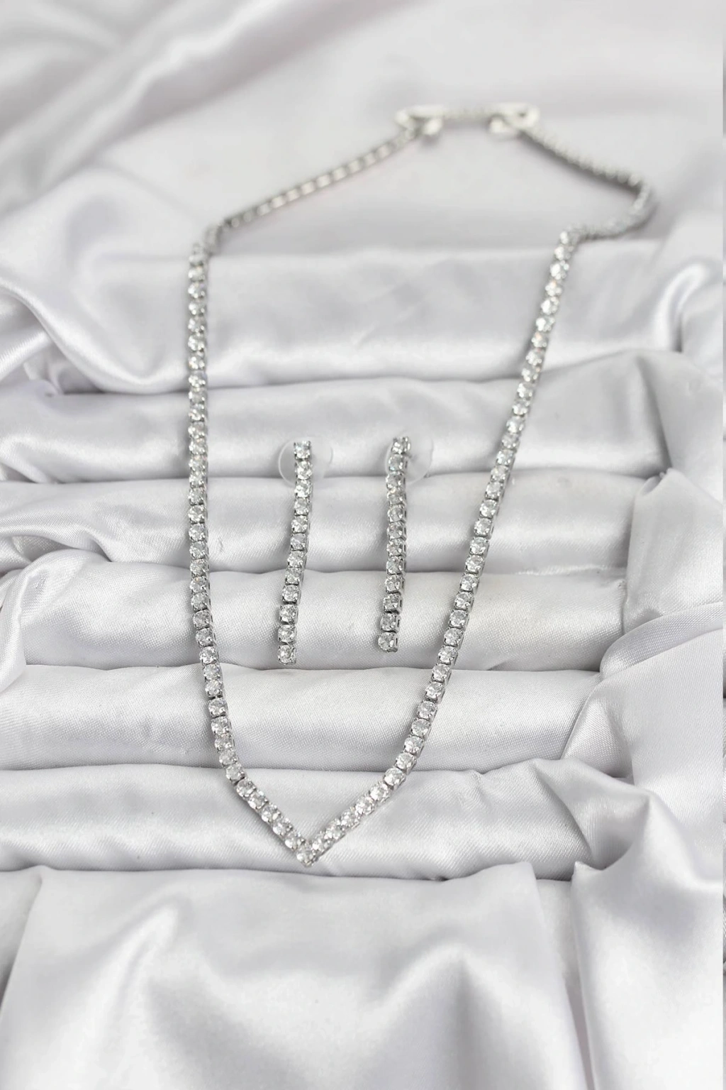 Gümüş Renk Zirkon Taşlı Kadın Kolye Küpe Seti