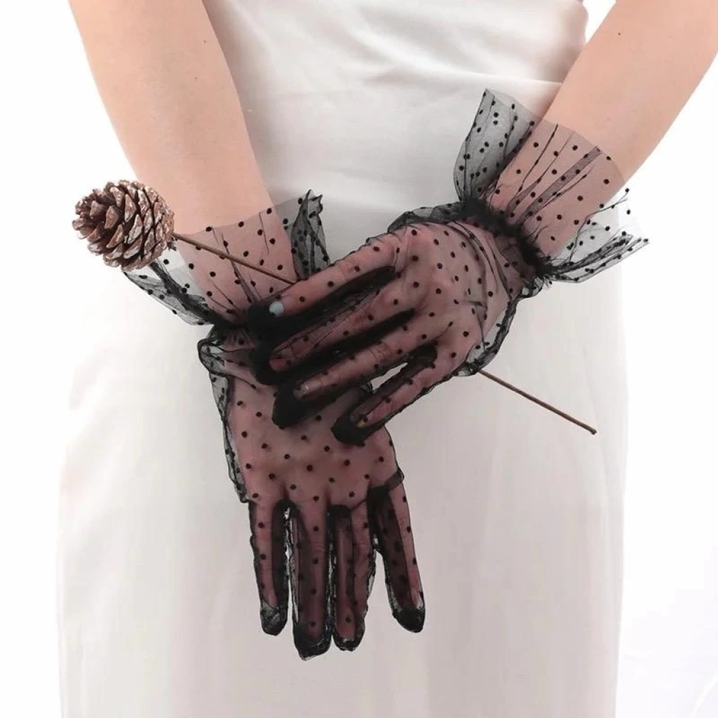 Kısa Boy Güpürlü Siyah Puantiyeli Tül Eldiven Siyah Renk