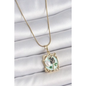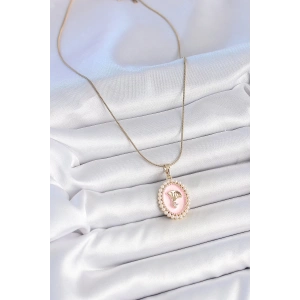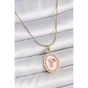 316L Çelik Gold Renk Zincir Pembe Mineli Çiçek İşlemli İnci Detay Portre Model Kadın Kolye
