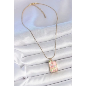 316L Çelik Gold Renk Zincir Pembe Mineli İncli Çiçek İşlemeli Portre Model Kadın Kolye