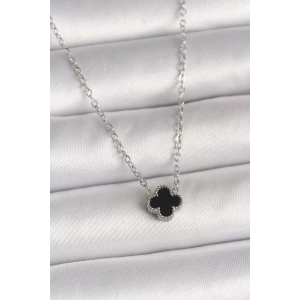 316L Çelik Gümüş Renk Siyah Yonca Model Kadın Kolye