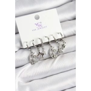 Pirinç Zİrkon Taşlı Ay ve Yıldız Model Gümüş Renk 3'lü Çift Kadın Küpe