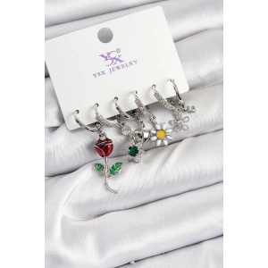 Pirinç Zİrkon Taşlı Gül Ve Papatya Model Gümüş Renk 3'lü Çift Kadın Küpe