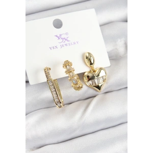 Pirinç Zİrkon Taşlı Kalp Model Gold Renk 3'lü Kadın Küpe