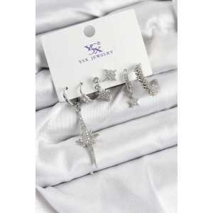 Pirinç Zİrkon Taşlı Kutup Yıldızı Model Gümüş Renk 3'lü Çift Kadın Küpe