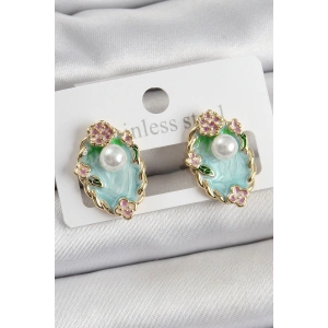 Pirinç Yeşil Mineli İnci Detaylı Sanatsal Portre Model Gold Renk Kadın Küpe
