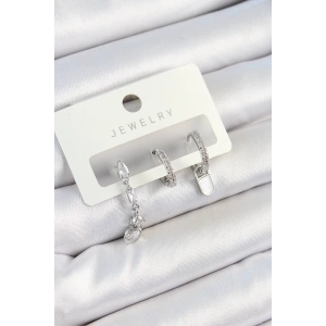 Pirinç Zirkon Taşlı Sallantılı Model Gümüş Renk 3'lü Çift Kadın Küpe Set