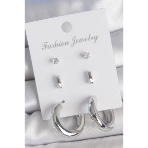 Pirinç Gümüş Renk Zirkon Taş Detay Halka Model 3 Çift Kadın Küpe Seti