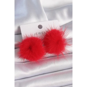 Kırmızı Tüylü Ponpon Model Kadın Küpe