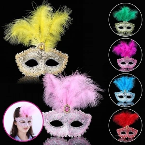 Mavi Dantel İşlemeli Mavi Tüylü Balo Parti Maskesi 17x20 Cm