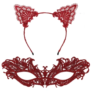 Romantik Kırmızı Dantel Maske Seti – Kedi Kulaklı Taç Ve Maske 3 No