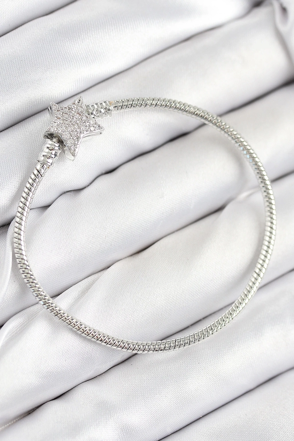 Pirinç Charm Zirkon Taşlı Yıldız Model Gümüş Renk Kadın Bileklik