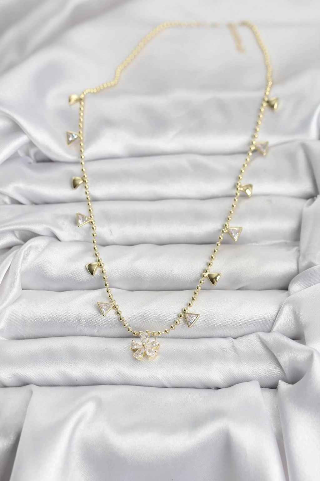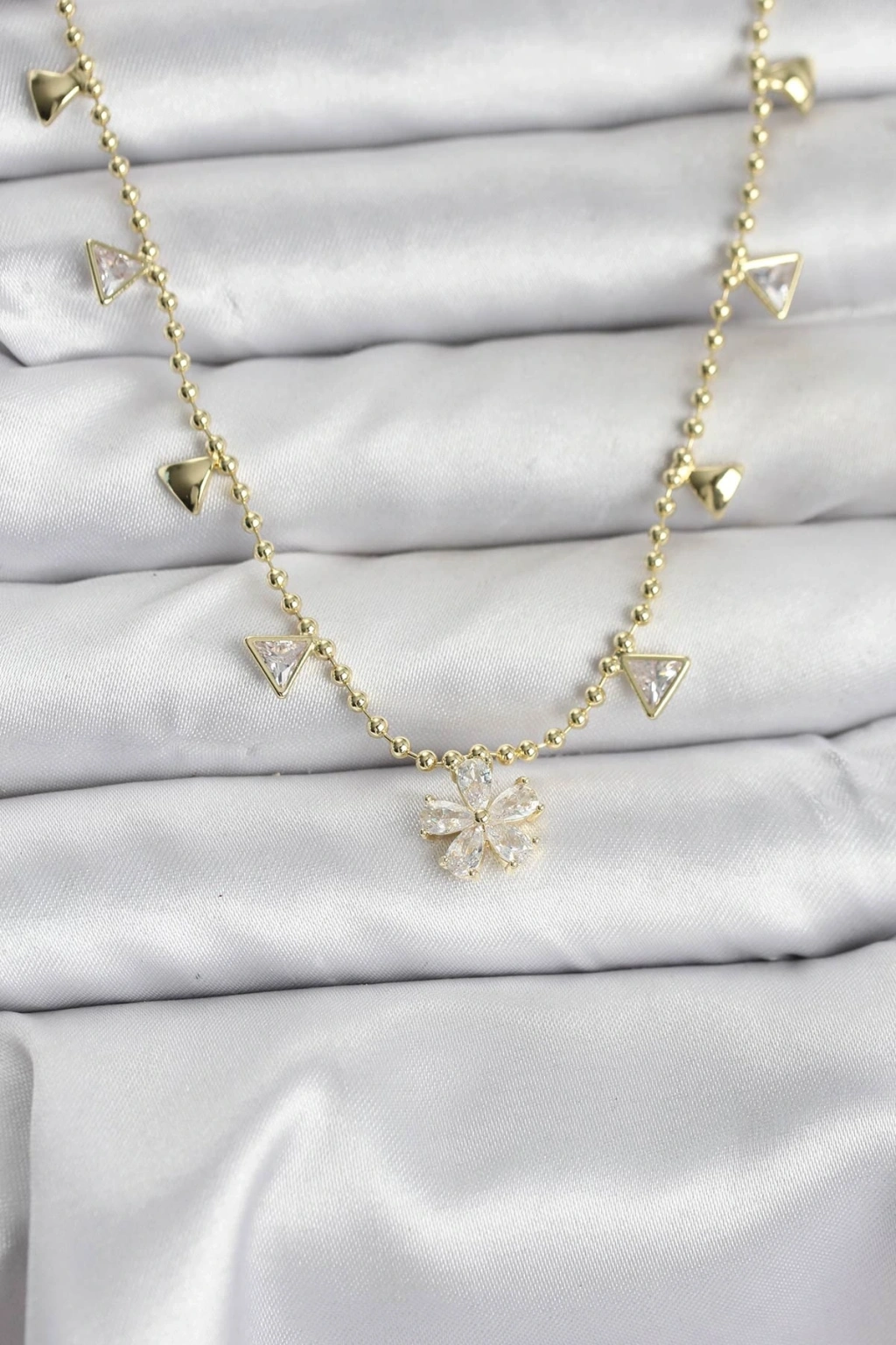 Pirinç Gold Renk Zirkon Taşlı Çiçek Model Kadın Kolye