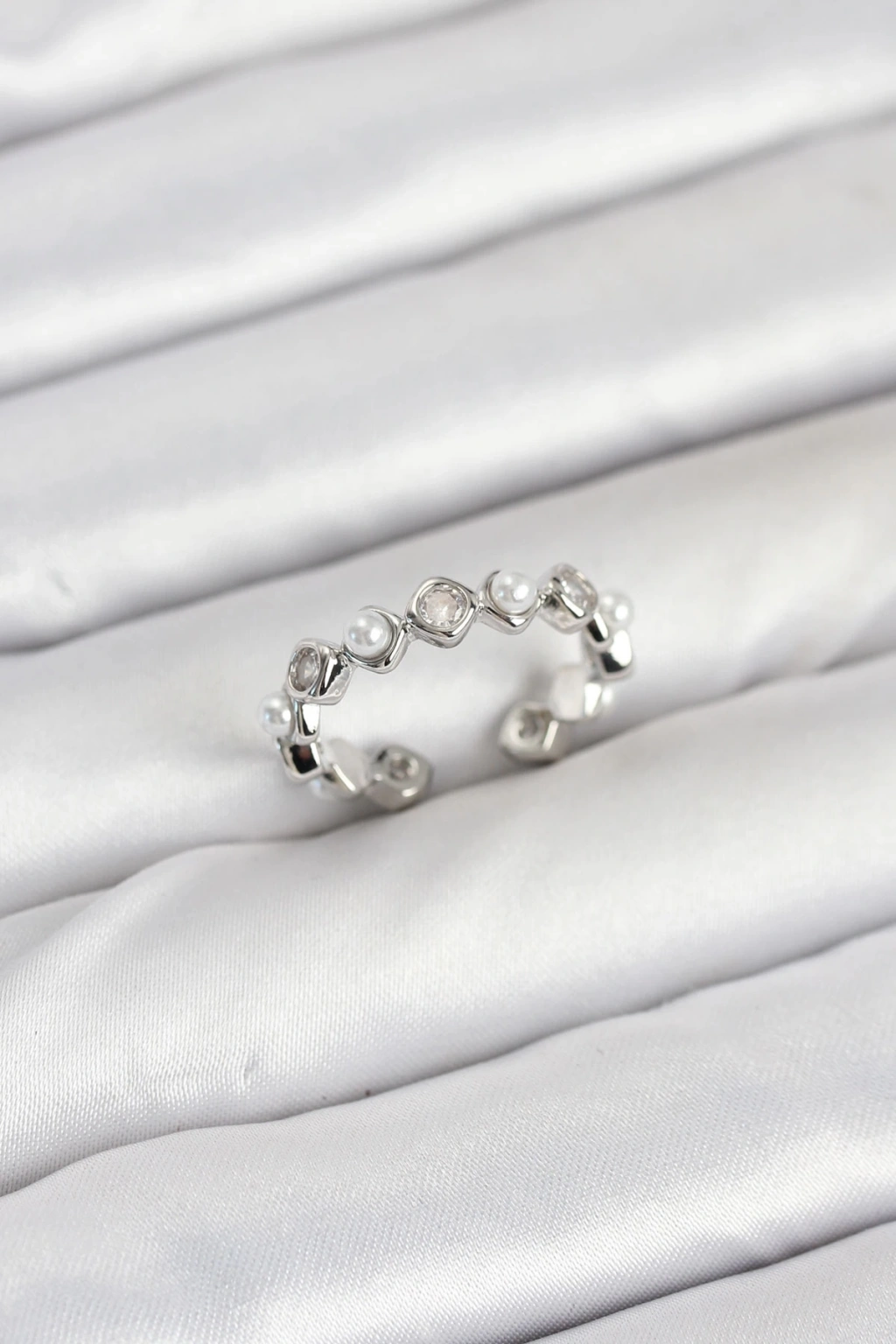 Pirinç Gümüş Renk Zirkon Taşlı İncili Kadın Yüzük
