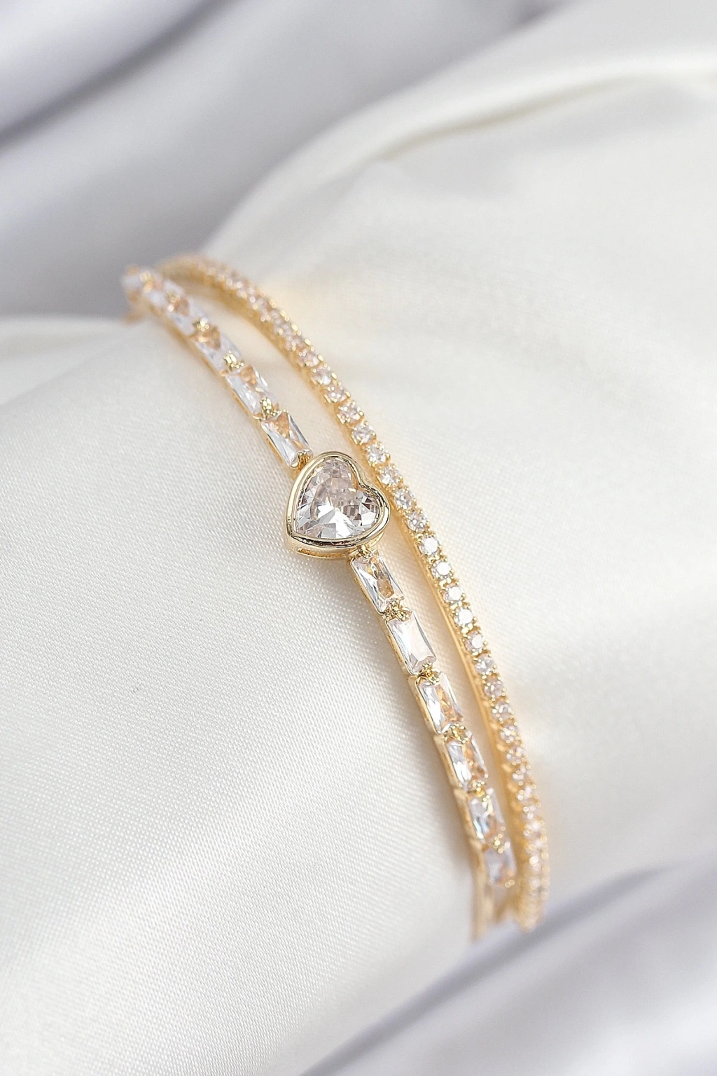 Pirinç Zirkon Taşlı Kalp Model Gold Renk Kadın Bileklik