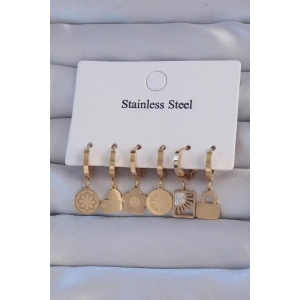 316L Çelik Gold Renk Zirkon Taşlı Çiçek Figürlü Kalp Model Halka Küpe Seti