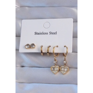 316L Çelik Gold Renk Zirkon Taşlı Kalp Model Halka Küpe Seti