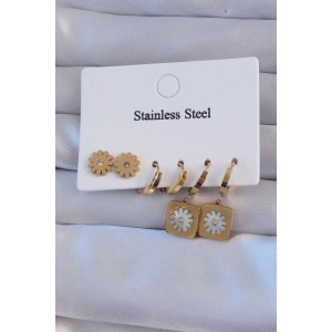 316L Çelik Gold Renk Zirkon Taşlı Sedefli Papatya Model Halka Küpe Seti