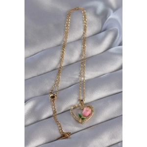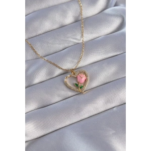 316L Çelik Zincirli Gold Renk Zirkon Taşlı Kalp İçinde Pembe Gül Tasarımlı Kolye
