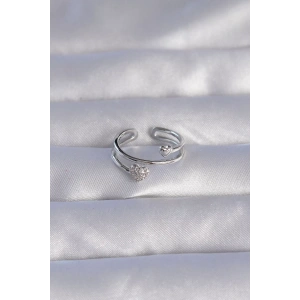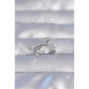 Pirinç Gümüş Renk Zirkon Taşlı Kalpli Model Ayarlanabilir Yüzük