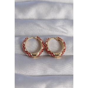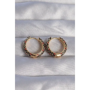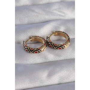 Pirinç Gold Renk Kırmızı Etnik Desenli Halka Küpe