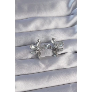 Pirinç Gümüş Renk İnci Detay Çiçek Tasarımlı Küpe