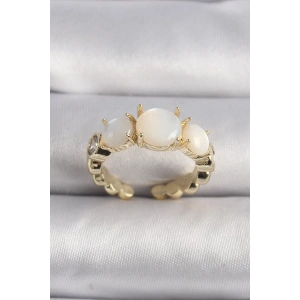 Pirinç Gold Renk Zirkon Taş Detaylı Beyaz Sedefli VIP Seri Kadın Yüzük