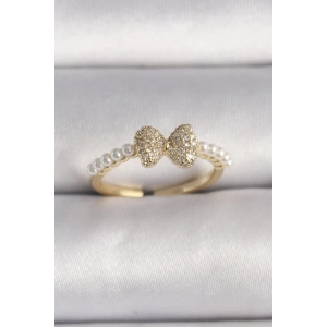 Pirinç Gold Renk Zirkon Taş Detaylı Beyaz Mineli Kelebek Model İnci Detay Ayarlanabilir Yüzük