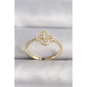 Pirinç Gold Renk Zirkon Taşlı Yonca Model İnci Detay Kadın Yüzük
