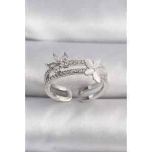 Pirinç Gümüş Renk Zirkon Taş Detaylı Beyaz Mineli Kelebek Figür İnci Detay Ayarlanabilir Yüzük